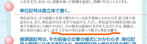 スペースにはいくつか種類がありますが、数値と単位の間のスペースには「改行をしないスペース」(ノーブレークスペース【no-break space、NBSP】)を使います。通常のスペースでもいいのですが、表内やページの端では、数値と単位が「泣き別れ」(印刷用語で1行内、1ページ内で表現したい内容が分割されてしまうこと)を起こしてしまうため制作会社が一から制作したトリセツではNBSPが使われているケースが多いでしょう。